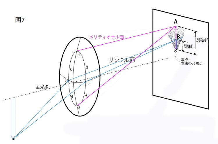 | ジロー: サジタルコマって、縦のずれなの?う〜ん、わからないなあ。 麗子先生: 手前の1点からレンズの数字1から8で囲われた範囲を光が通過し、四角いスクリーンに焦点を結ぶ時、そこに外光性コマ収差 が発生すると、本来の合焦点である「黒点」から外側に向けて図7のような矢羽形状の収差滲みが発生するわ。 その時、レンズの「1,5」を通るメリディオナル面の合焦点は上の図で示したように「点A」になり、これが最大の隔たりに なるのよ。 そしてこの本来の合焦点から点Aまでのずれを「メリディオナルコマ収差」というわ。 ジロー: ふむふむ。何とか付いていっています。 麗子先生: レンズの「1,5」を通るメリディオナル面と直角に交わる「3,7」を通る光線面が「サジタル面」というのは分かるわね? はるか: はい。 麗子先生 : サジタルコマ収差とは、この「3,7」を通った光線が合焦する「点B」が本来の合焦点から隔たった「ずれ」を示すの。 ジロー: じゃあ、サジタルコマって「縦のずれ」っていうことなの? 麗子先生: 収差の原理としてはそうだけど、目に見える形は違うわね。光線の角度とレンズへ入る位置によって、徐々にずれが大きく なってむしろ横に広がっていくという、とってもたちの悪い性質なのね。 そしてサジタルコマの大きさの2倍がボケ円の直径になるという関係があるので、縦の乖離であるサジタルコマのずれ自体が 「円の大きさ=コマ収差全体の大きさを表す」と考えても、間違いではないですね。 はるか: 確かに、球面収差では、その中心はいつも中心で動いていないわ。 麗子先生: 球面収差は見方によっては、「きれいな」ボケに結びついていくものともいえないことはないけれど、 サジタルコマのように方向性を持った収差は決して美しいボケには繋がらないし、そもそもピントは 合った状態ですからね。 (矢羽ボケ愛好家の方:申し訳ありません) ジロー: 本当にいろいろなレンズ(とくにダブルガウス型)の特許申請にはサジタルコマ撲滅みたいなスローガンが 書いてあるからなあ。 麗子先生: 今日は長くなったわね。 じゃあ皆さん、今日はここでおしまいです。 |