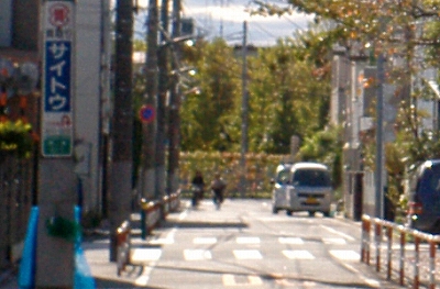 逆光/これは圧倒的に優れた描写だといえます。フレア・ゴーストとは無縁ですし、拡大部分の描写も言うことはありません。中央部拡大では、電柱の住所表記が読めるくらいで、さすがの高性能レンズの面目躍如です。