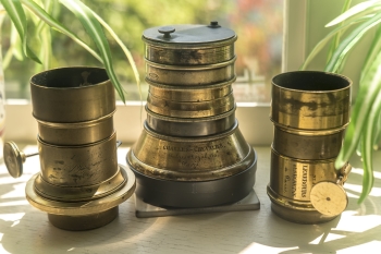 左から、 Voigtlander (original) Petzval lens c150mmf3.5-4 No.2062 Chevalier PHOTOGRAPHE A VERRES COMBINES 250mmf5.6 Lerebours et Secretan 6inch Gaudin Petzval lens 6inch |